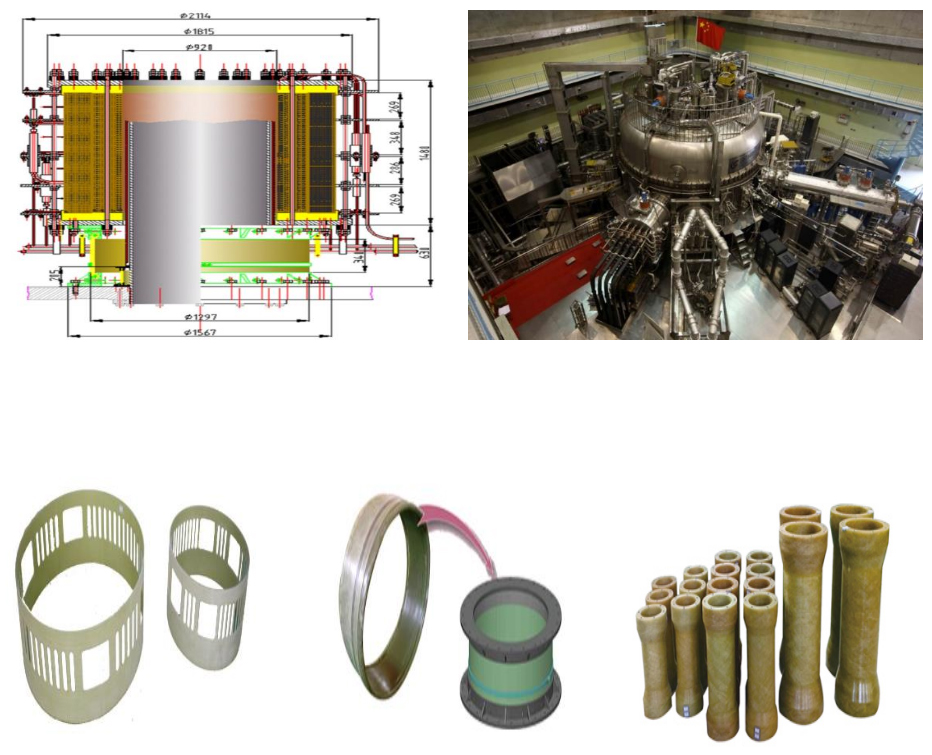 穩(wěn)態(tài)強(qiáng)磁超導(dǎo)裝置用絕緣材料,其絕緣構(gòu)件滿足-196℃的超低溫、45T的超強(qiáng)磁場下承受高軸壓、大扭矩等苛刻工況要求,通過對超低溫材料性能設(shè)計(jì)、預(yù)埋層聯(lián)編織預(yù)成型體液體成型復(fù)合材料工藝技術(shù)等研究, 成功研制了超強(qiáng)磁場超低溫復(fù)合材料部件,保障了以“托克馬克”為代表的核聚變裝置穩(wěn)定安全運(yùn)行。
